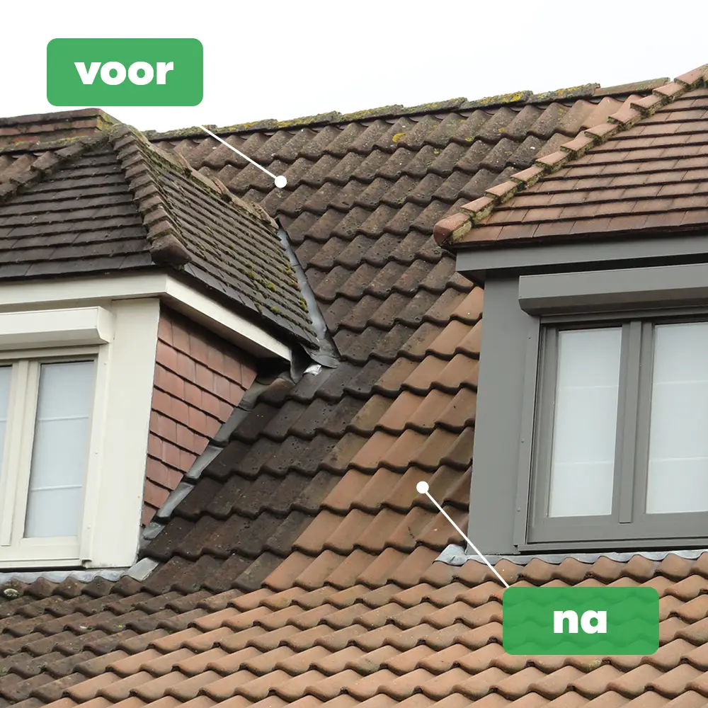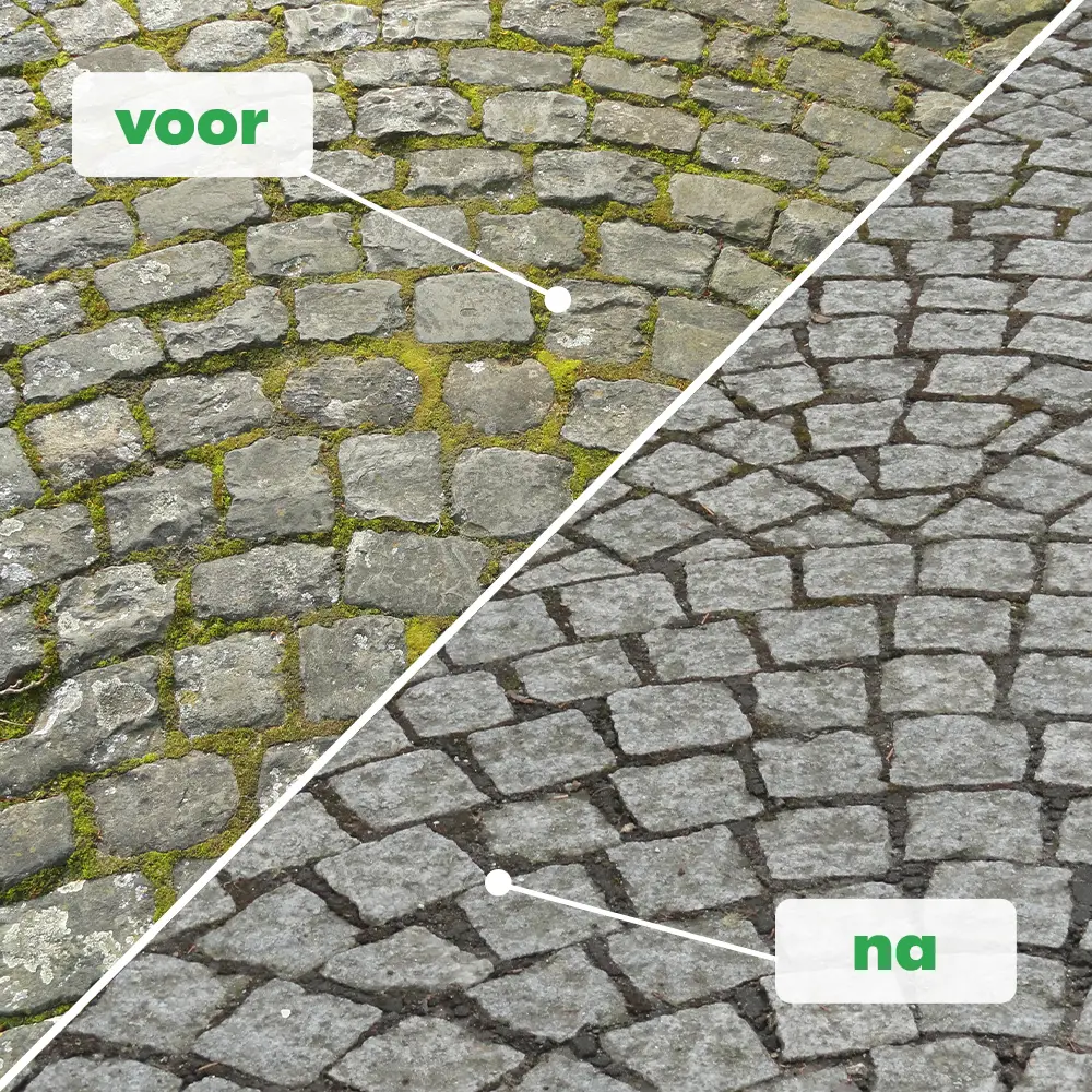 Binnen enkele dagen verdwijnen de mossen en groene aanslag vanzelf en blijft uw oprit, gevel, dak of terras maandenlang schoon.